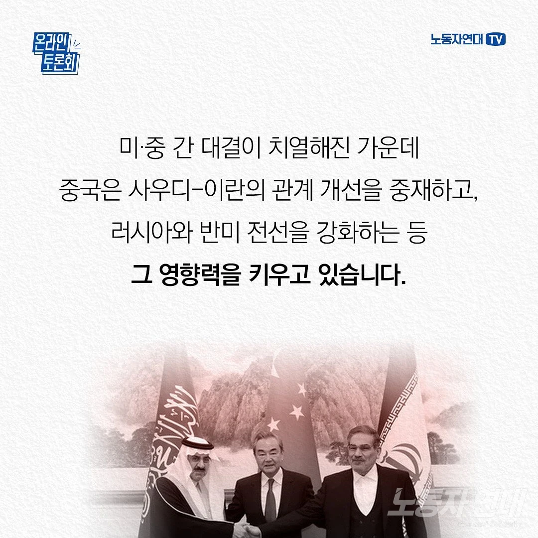 미·중 간 대결이 치열해진 가운데 중국은 사우디-이란의 관계 개선을 중재하고, 러시아와 반미 전선을 강화하는 등 그 영향력을 키우고 있습니다. 시진핑은 이제 중국이 미국을 뛰어넘는 글로벌 슈퍼 파워가 될 것이라고 합니다. 과연 그럴까요? 중국의 국제적 부상을 어떻게 봐야 할까요? 국제 질서를 흔드는 최대 위협일까요, 아니면 미국을 견제하는 균형추일까요? 급변하는 국제 정치 속 중국의 영향력 증대와 그 모순을 살펴보려고 합니다.