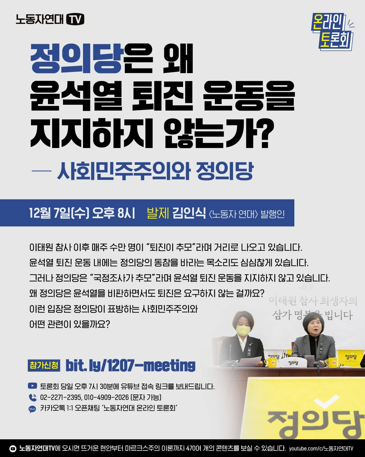 이태원 참사 이후 매주 수만 명이 “퇴진이 추모”라며 거리로 나오고 있습니다. 윤석열 퇴진 운동 내에는 정의당의 동참을 바라는 목소리도 심심찮게 있습니다. 그러나 정의당은 “국정조사가 추모”라며 윤석열 퇴진 운동을 지지하지 않고 있습니다. 왜 정의당은 윤석열을 비판하면서도 퇴진은 요구하지 않는 걸까요? 이런 입장은 정의당이 표방하는 사회민주주의와 어떤 관련이 있을까요?