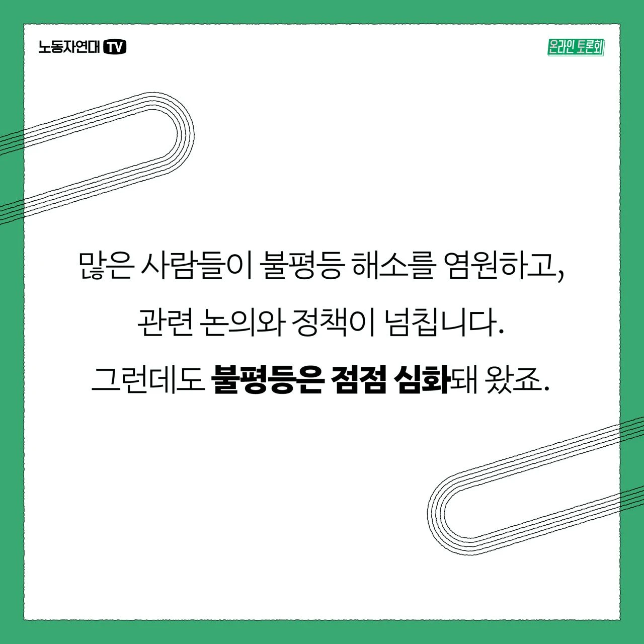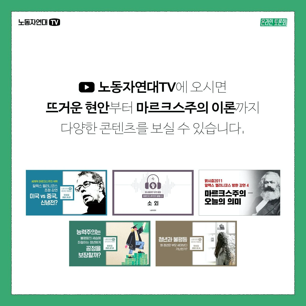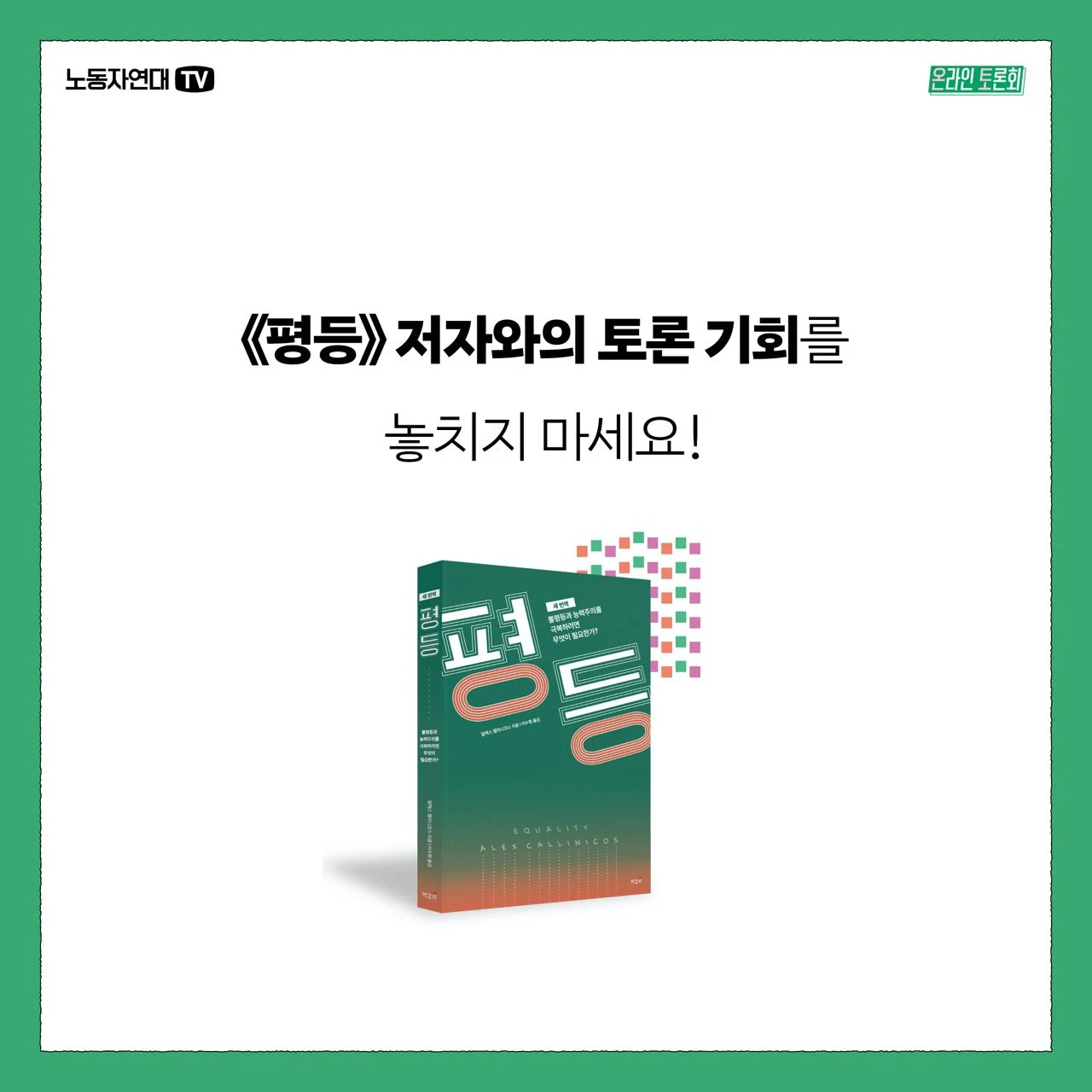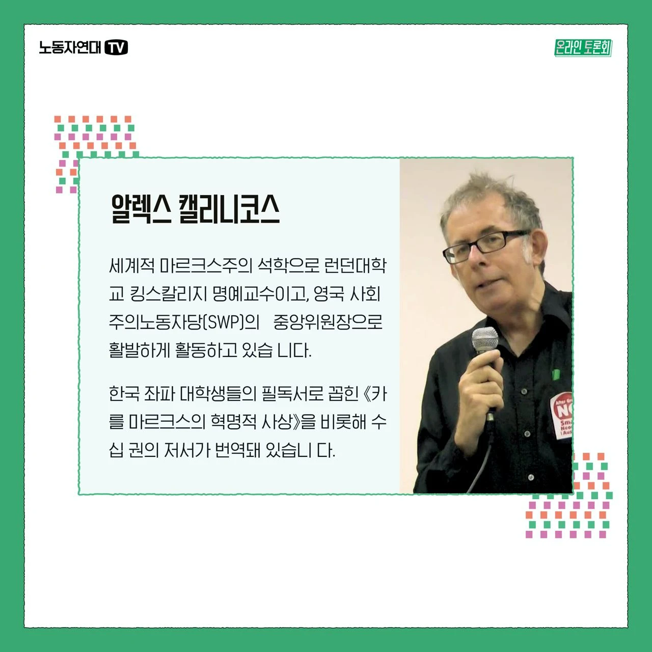 세계적 마르크스주의 석학으로 런던대학교 킹스칼리지 명예교수이고, 영국 사회주의노동자당(SWP)의 중앙위원장으로 활발하게 활동하고 있습니다. 한국 좌파 대학생들의 필독서로 꼽힌 《카를 마르크스의 혁명적 사상》을 비롯해 수십 권의 저서가 번역돼 있습니다. ※ 전문 통역사의 순차통역이 제공됩니다. ———————— ○ 유튜브 실시간 생중계 https://www.youtube.com/c/노동자연대TV ———————— 한국 사회의 불평등은 정말 심각합니다. 더 나은 삶을 원하는 청년들은 불평등이라는 장벽에 숨이 막힙니다. 특히 부와 권력의 대물림에 절망하죠. 하지만 능력주의가 이런 청년들에게 공정을 보장했을까요? 많은 사람들이 불평등 해소를 염원하고, 관련 논의와 정책이 넘칩니다. 그런데도 불평등은 점점 심화돼 왔죠. 세계적 마르크스주의 석학 캘리니코스가 말합니다. 왜 이토록 불평등한지, 실질적 평등은 어떻게 가능한지, 그것을 원한다면 무엇을 해야 하는지. 《평등》 저자와의 토론 기회를 놓치지 마세요! - 주최: 노동자연대TV × 도서출판 책갈피 ———————— - 문의: 02-2271-2395, 010-4909-2026(문자 가능), mail@workerssolidarity.org - 카카오톡 1:1 오픈채팅 ‘노동자연대 온라인 토론회’ https://open.kakao.com/o/sE3M42Ud ▷ 노동자연대TV에 오시면 뜨거운 현안부터 마르크스주의 이론까지 다양한 콘텐츠를 보실 수 있습니다. https://youtube.com/c/노동자연대TV