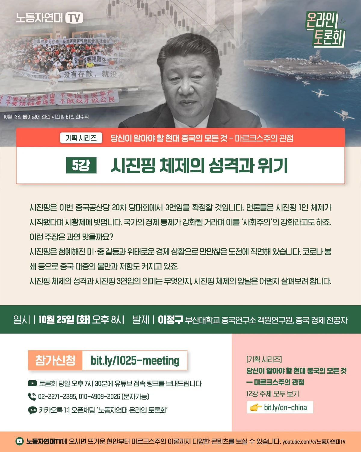 - 일시: 10월 25일(화) 오후 8시 - 발제: 이정구 (부산대학교 중국연구소 객원연구원, 중국 경제 전공자)