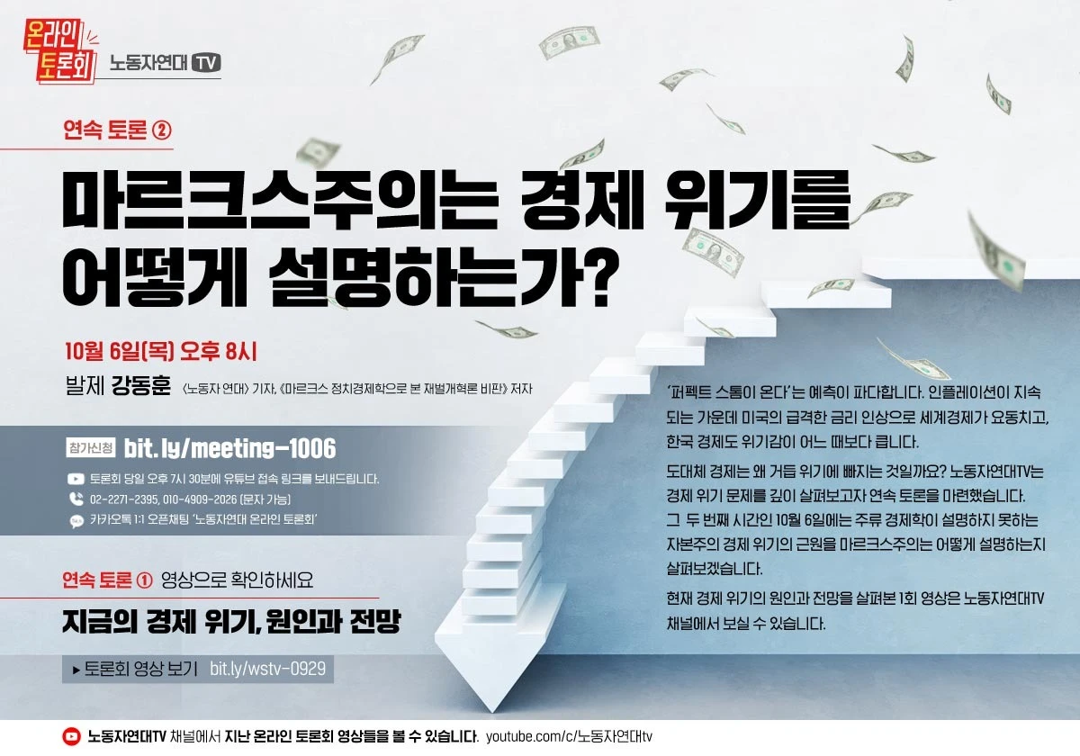 ‘퍼펙트 스톰이 온다’는 예측이 파다합니다. 인플레이션이 지속되는 가운데 미국의 급격한 금리 인상으로 세계경제가 요동치고, 한국 경제도 위기감이 어느 때보다 큽니다. 도대체 경제는 왜 거듭 위기에 빠지는 것일까요? 노동자연대TV는 경제 위기 문제를 깊이 살펴보고자 연속 토론을 마련했습니다. 그 두 번째 시간인 10월 6일에는 주류 경제학이 설명하지 못하는 자본주의 경제 위기의 근원을 마르크스주의는 어떻게 설명하는지 살펴보겠습니다. 현재 경제 위기의 원인과 전망을 살펴본 1회 영상은 노동자연대TV 채널에서 보실 수 있습니다.