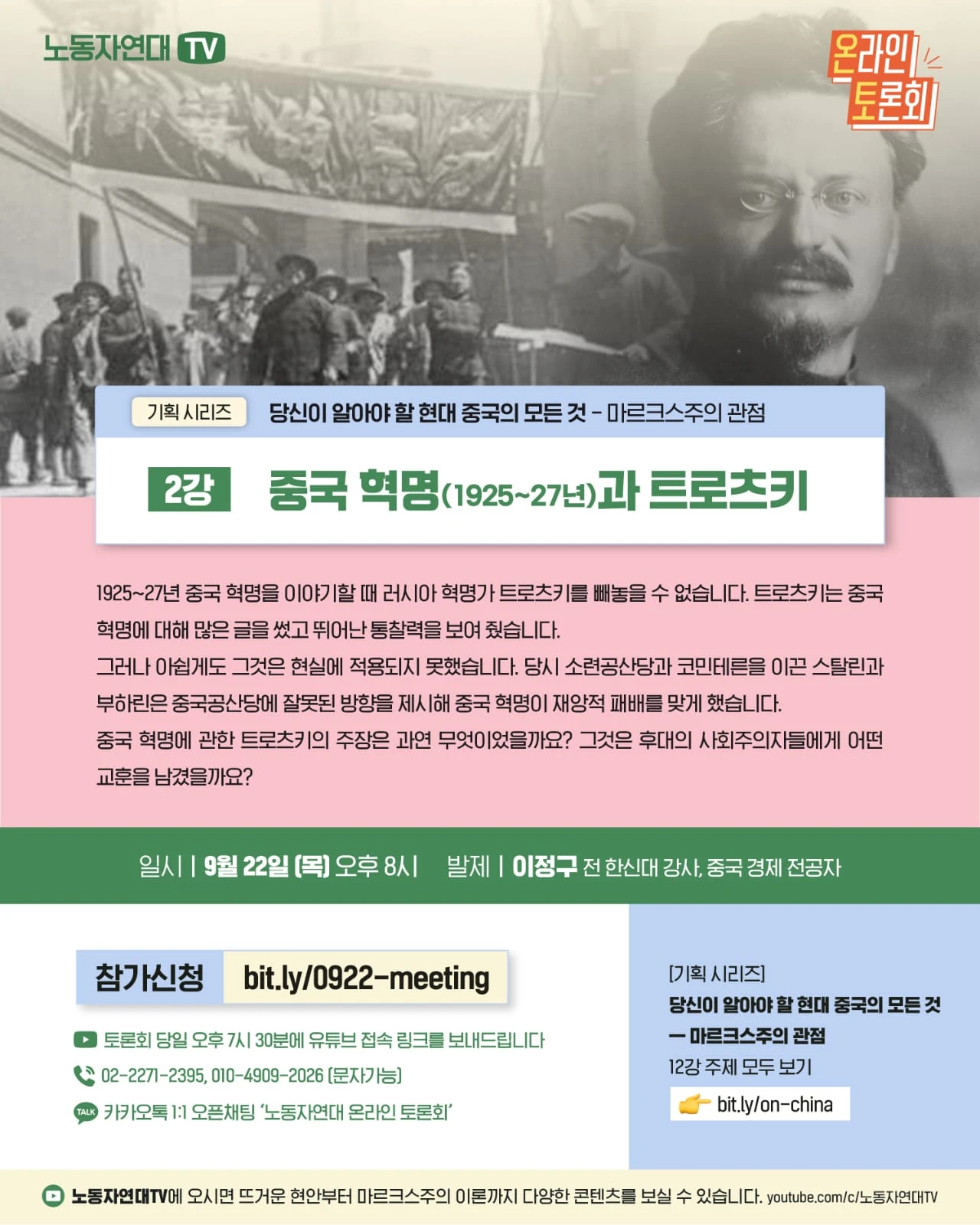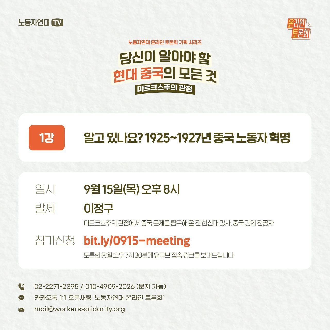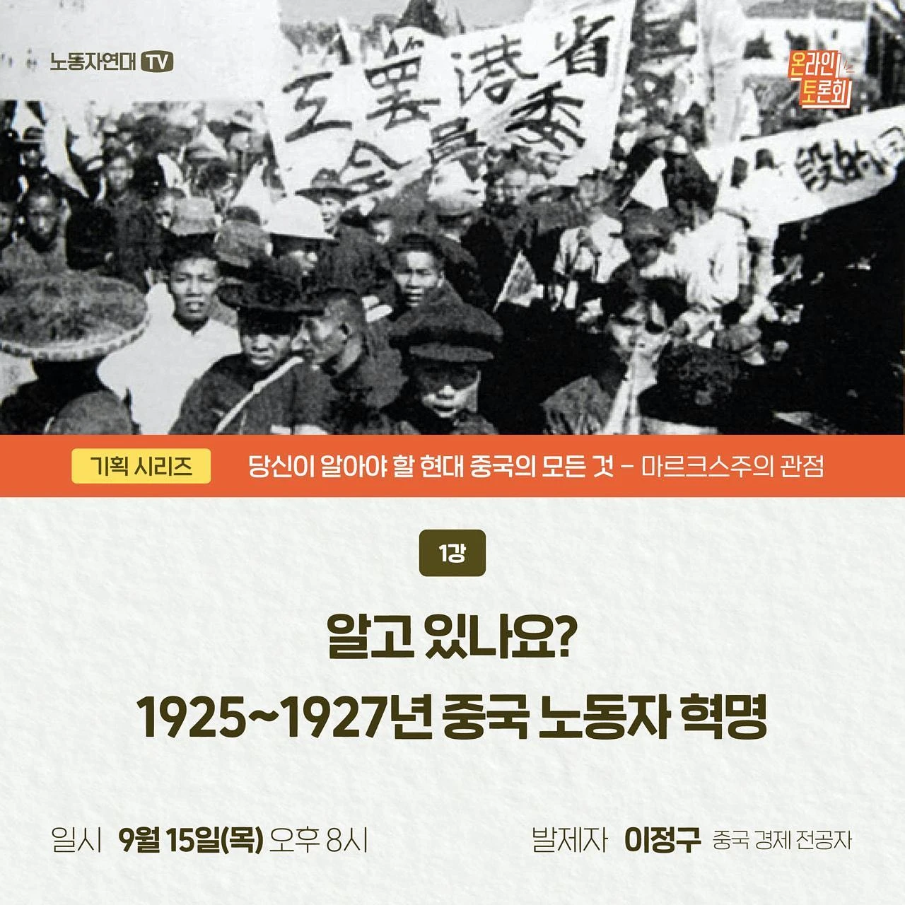 [1강] 알고 있나요? 1925~27년 중국 노동자 혁명 - 일시: 9월 15일(목) 오후 8시 - 발제: 이정구 (전 한신대 강사, 중국 경제 전공자) ○ 방청 신청 https://bit.ly/0915-meeting (※ 토론회 당일 오후 7시 30분에 유튜브 접속 링크를 보내드립니다.)