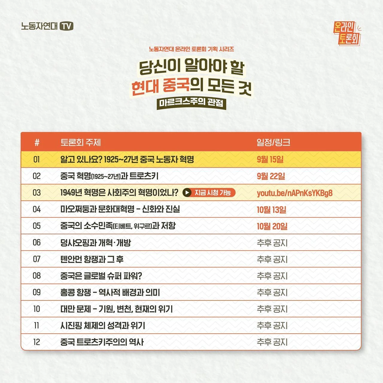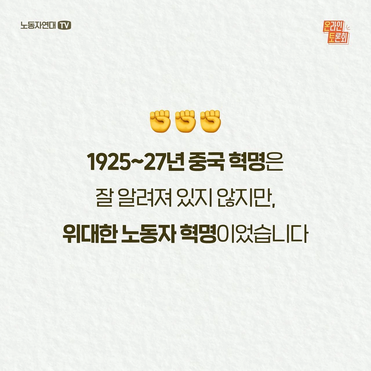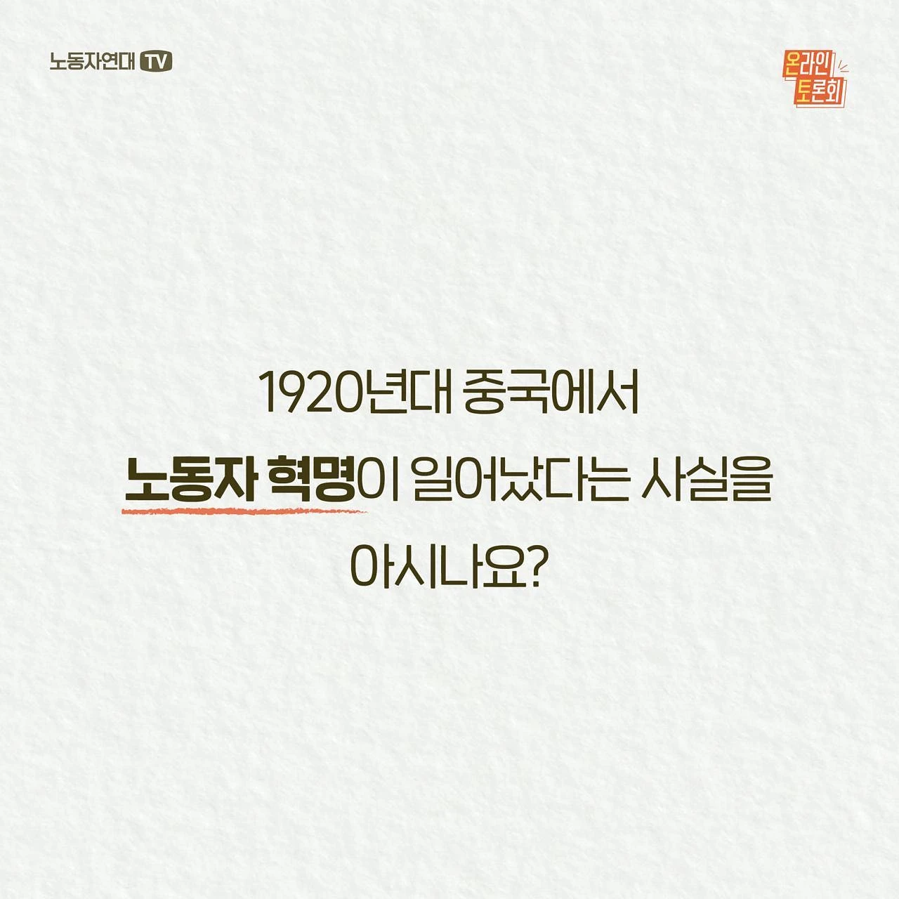 [1강] 알고 있나요? 1925~27년 중국 노동자 혁명 - 일시: 9월 15일(목) 오후 8시 - 발제: 이정구 (전 한신대 강사, 중국 경제 전공자) ○ 방청 신청 https://bit.ly/0915-meeting (※ 토론회 당일 오후 7시 30분에 유튜브 접속 링크를 보내드립니다.)
