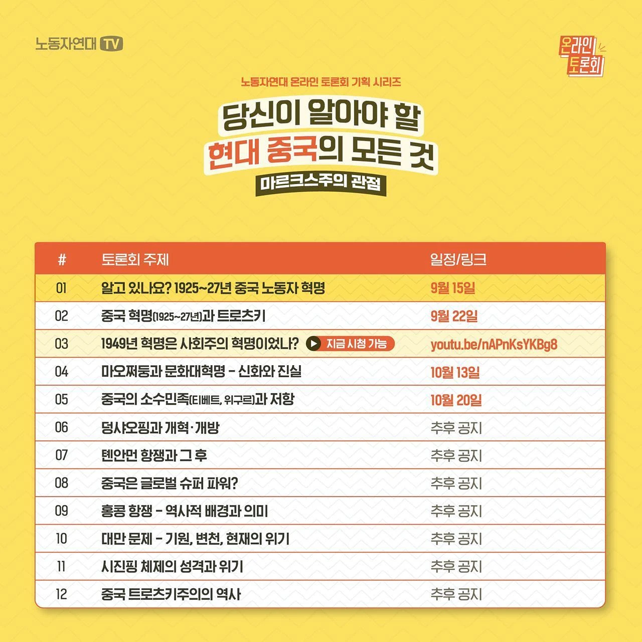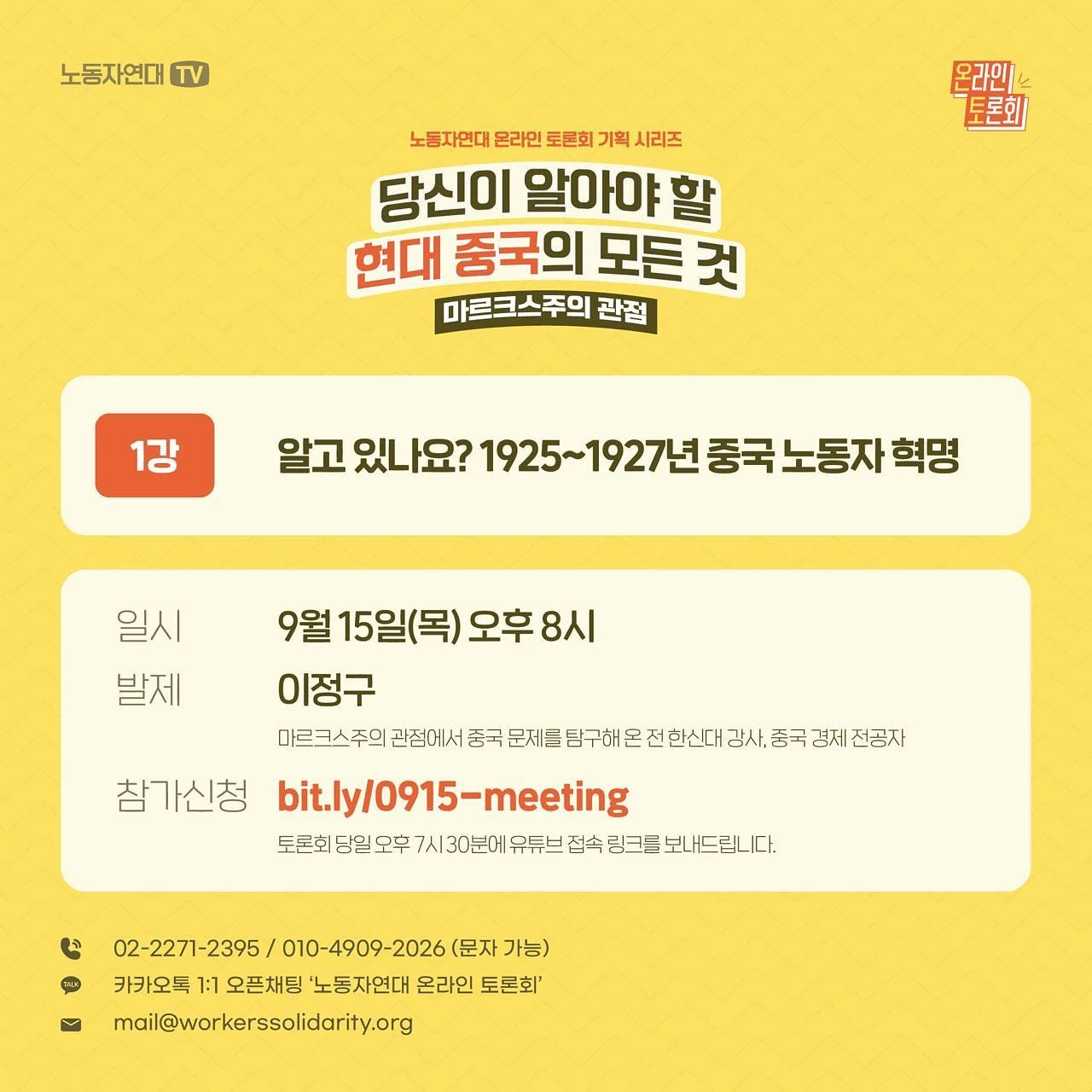 [1강] 알고 있나요? 1925~27년 중국 노동자 혁명 - 일시: 9월 15일(목) 오후 8시 - 발제: 이정구 (전 한신대 강사, 중국 경제 전공자) ○ 참가 신청 https://bit.ly/0915-meeting 토론회 당일 오후 7시 30분에 유튜브 접속 링크를 보내드립니다.