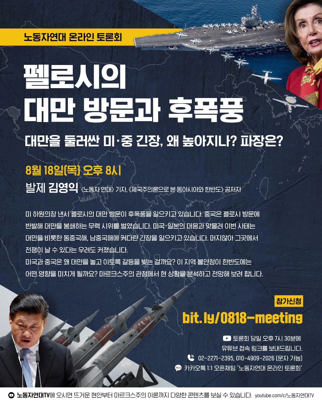 미 하원의장 낸시 펠로시의 대만 방문이 후폭풍을 일으키고 있습니다. 중국은 펠로시 방문에 반발해 대만을 봉쇄하는 무력 시위를 벌였습니다. 미국·일본의 대응과 맞물려 이번 사태는 대만을 비롯한 동중국해, 남중국해에 커다란 긴장을 일으키고 있습니다. 머지않아 그곳에서 전쟁이 날 수 있다는 우려도 커졌습니다. 미국과 중국은 왜 대만을 놓고 이토록 갈등을 빚는 걸까요? 이 지역 불안정이 한반도에는 어떤 영향을 미치게 될까요? 마르크스주의 관점에서 현 상황을 분석하고 전망해 보려 합니다.