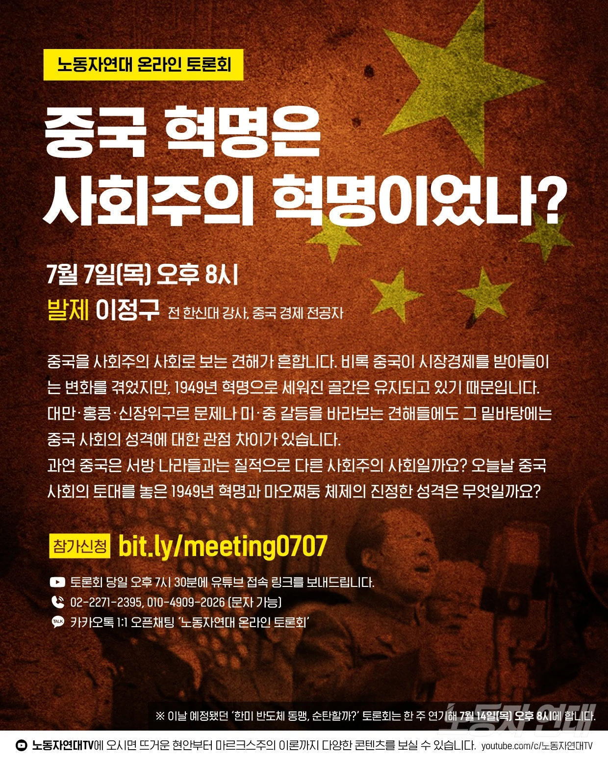 - 일시: 7월 7일(목) 오후 8시 - 발제: 이정구 (전 한신대 강사, 중국 경제 전공자)