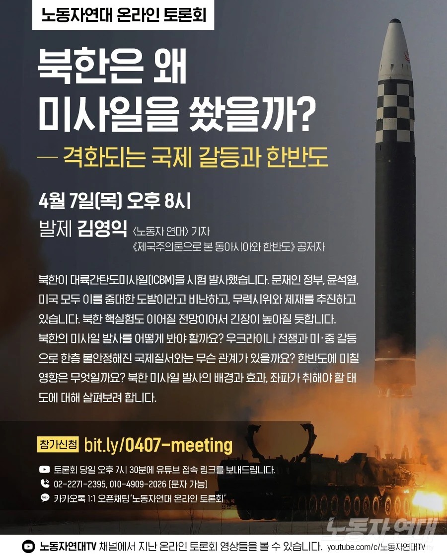 북한이 대륙간탄도미사일(ICBM)을 시험 발사했습니다. 문재인 정부, 윤석열, 미국 모두 이를 중대한 도발이라고 비난하고, 무력시위와 제재를 추진하고 있습니다. 북한 핵실험도 이어질 전망이어서 긴장이 높아질 듯합니다. 북한의 미사일 발사를 어떻게 봐야 할까요? 우크라이나 전쟁과 미·중 갈등으로 한층 불안정해진 국제질서와는 무슨 관계가 있을까요? 한반도에 미칠 영향은 무엇일까요? 북한 미사일 발사의 배경과 효과, 좌파가 취해야 할 태도에 대해 살펴봅니다.