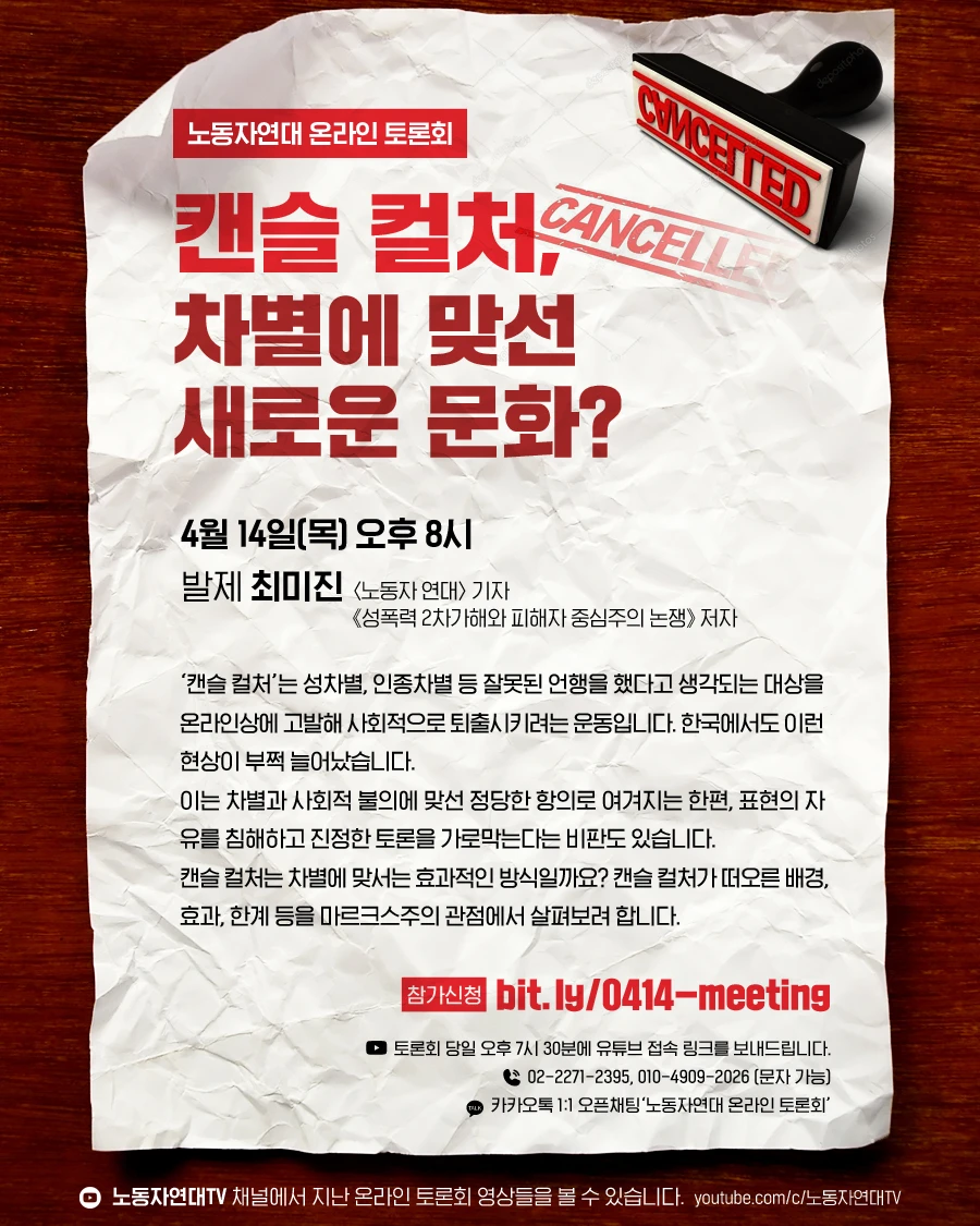 ‘캔슬 컬처’는 성차별, 인종차별 등 잘못된 언행을 했다고 생각되는 대상을 온라인상에 고발해 사회적으로 퇴출시키려는 운동입니다. 한국에서도 이런 현상이 부쩍 늘어났습니다. 이는 차별과 사회적 불의에 맞선 정당한 항의로 여겨지는 한편, 표현의 자유를 침해하고 진정한 토론을 가로막는다는 비판도 있습니다. 캔슬 컬처는 차별에 맞서는 효과적인 방식일까요? 캔슬 컬처가 떠오른 배경, 효과, 한계 등을 마르크스주의 관점에서 살펴보려 합니다.