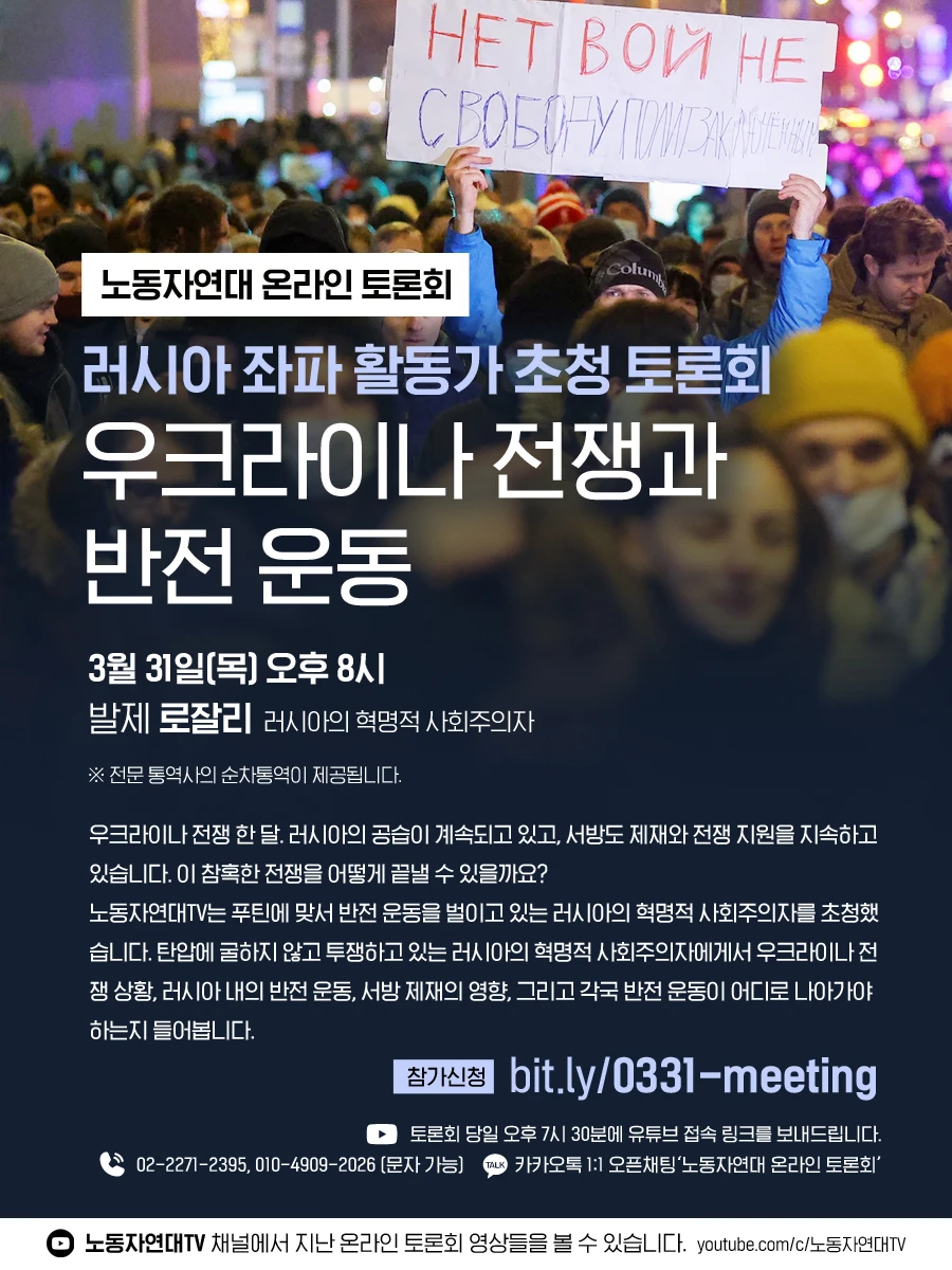 우크라이나 전쟁 한 달. 러시아의 공습이 계속되고 있고, 서방도 제재와 전쟁 지원을 지속하고 있습니다. 이 참혹한 전쟁을 어떻게 끝낼 수 있을까요? 노동자연대TV는 푸틴에 맞서 반전 운동을 벌이고 있는 러시아의 혁명적 사회주의자를 초청했습니다. 탄압에 굴하지 않고 투쟁하고 있는 러시아의 혁명적 사회주의자에게서 우크라이나 전쟁 상황, 러시아 내의 반전 운동, 서방 제재의 영향, 그리고 각국 반전 운동이 어디로 나아가야 하는지 들어봅니다.