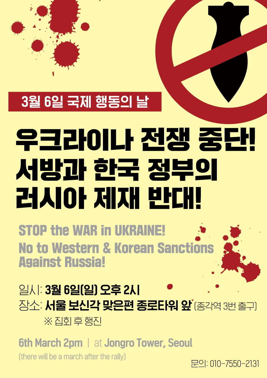 3월 6일 ‘우크라이나 전쟁 중단 국제행동의 날’ 시위가 국제적으로 준비되고 있습니다. 이 시위는 영국의 전쟁저지연합(‘Stop the War Coalition’, 2003년 미국의 이라크 전쟁에 맞서 1500만 명 규모가 참가했던 국제 공동 행동을 발의한 연대체)이 제안했습니다. 한국에서도 바로 내일(3월 6일) 오후 2시에 ‘우크라이나 전쟁 중단! 서방과 한국의 러시아 제재 반대! 국제 행동의 날’집회가 열립니다. 함께 모여 단호한 반전 염원을 표현해 봅시다.