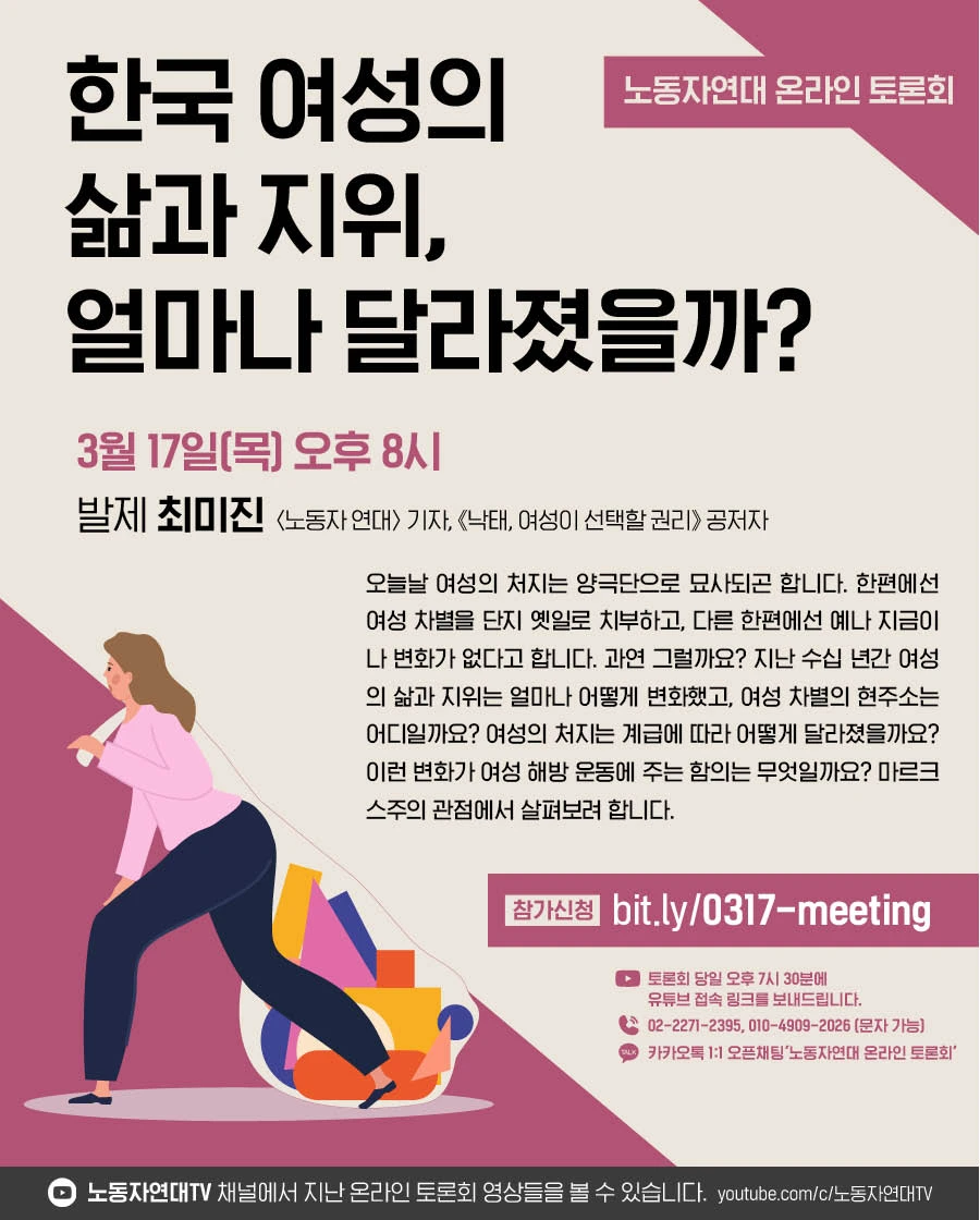 오늘날 여성의 처지는 양극단으로 묘사되곤 합니다. 한편에선 여성 차별을 단지 옛일로 치부하고, 다른 한편에선 예나 지금이나 변화가 없다고 합니다. 과연 그럴까요? 지난 수십 년간 여성의 삶과 지위는 얼마나 어떻게 변화했고, 여성 차별의 현주소는 어디일까요? 여성의 처지는 계급에 따라 어떻게 달라졌을까요? 이런 변화가 여성 해방 운동에 주는 함의는 무엇일까요? 마르크스주의 관점에서 살펴보려 합니다.