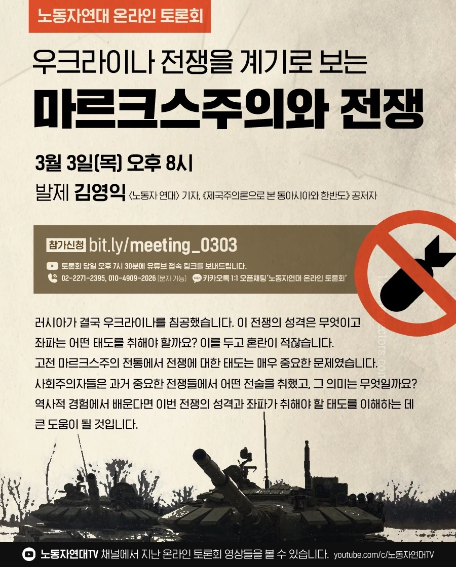 ※ 사흘 전 러시아가 우크라이나를 침공함에 따라 3월 3일(목) 온라인 토론회 주제를 급히 변경했습니다. 우크라이나 전쟁을 계기로 마르크스주의와 전쟁에 관해 토론해 보려 합니다. 많은 관심 부탁드립니다. 애초 예정됐던 ‘한국 여성의 삶과 지위, 얼마나 달라졌을까?’ 토론회는 3월 17일로 연기합니다. 이 토론에도 많은 관심 부탁드립니다.