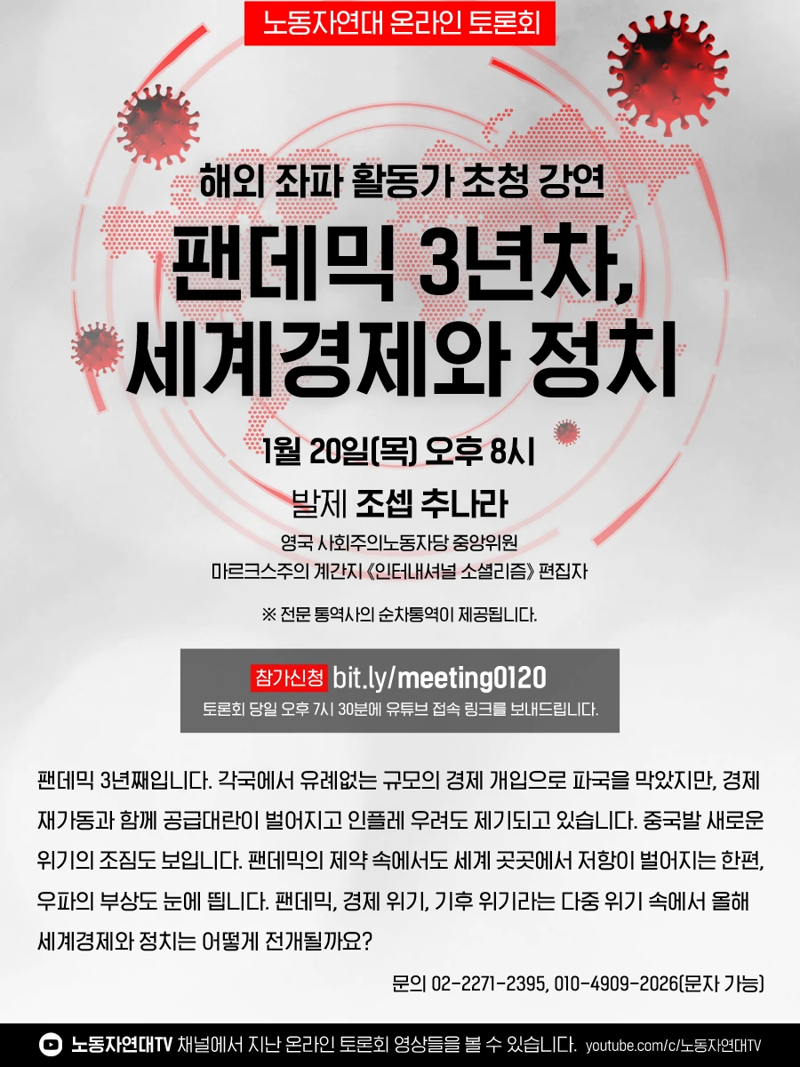 - 일시: 2022년 1월 13일(목) 오후 8시 - 발제: 김문성 (〈노동자 연대〉 기자, 《최근 한국 현대사 - 해방부터 문재인 정부까지 역사유물론으로 보기》, 《문재인 정부, 촛불 염원을 저버리다》 공저자)