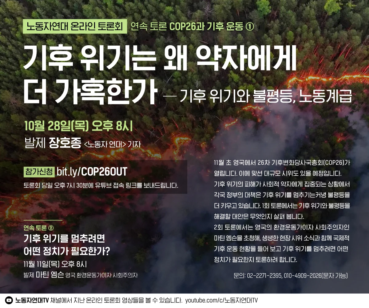 11월 초 영국에서 26차 기후변화당사국총회(COP26)가 열립니다. 이에 맞선 대규모 시위도 있을 예정입니다. 기후 위기의 피해가 사회적 약자에게 집중되는 상황에서 각국 정부의 대책은 기후 위기를 멈추기는커녕 불평등을 더 키우고 있습니다. 1회 토론에서는 기후 위기와 불평등을 해결할 대안은 무엇인지 살펴 봅니다. 2회 토론에서는 영국의 환경운동가이자 사회주의자인 마틴 엠슨을 초청해, 생생한 현장 시위 소식과 함께 국제적 기후 운동 현황을 들어 보고 기후 위기를 멈추려면 어떤 정치가 필요한지 토론하려 합니다.
