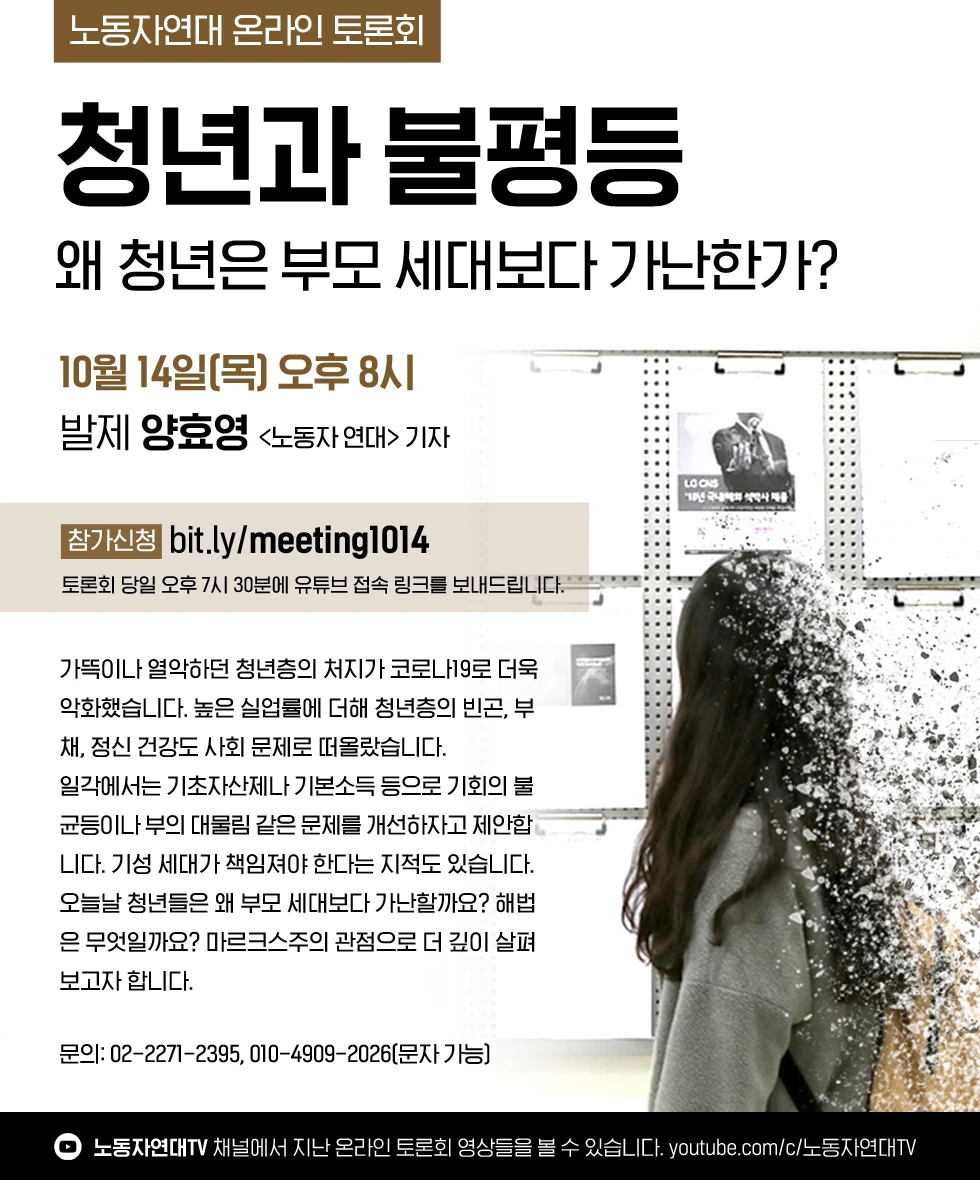 가뜩이나 열악하던 청년층의 처지가 코로나19로 더욱 악화했습니다. 높은 실업률에 더해 청년층의 빈곤, 부채, 정신 건강도 사회 문제로 떠올랐습니다. 일각에서는 기초자산제나 기본소득 등으로 기회의 불균등이나 부의 대물림 같은 문제를 개선하자고 제안합니다. 기성 세대가 책임져야 한다는 지적도 있습니다. 오늘날 청년들은 왜 부모 세대보다 가난할까요? 해법은 무엇일까요? 마르크스주의 관점으로 더 깊이 살펴보고자 합니다.