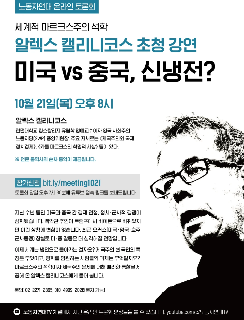 👉 토론회 소개 영상 https://youtube.com/shorts/Px5zn8ZxtcE - 일시 : 10월 21일(목) 오후 8시 - 발제 : 알렉스 캘리니코스 (런던대학교 킹스칼리지 유럽학 명예교수이자 영국 사회주의노동자당(SWP) 중앙위원장. 주요 저서로는 《제국주의와 국제 정치경제》, 《카를 마르크스의 혁명적 사상》 등이 있다.) ※ 전문 통역사의 순차통역이 제공됩니다.