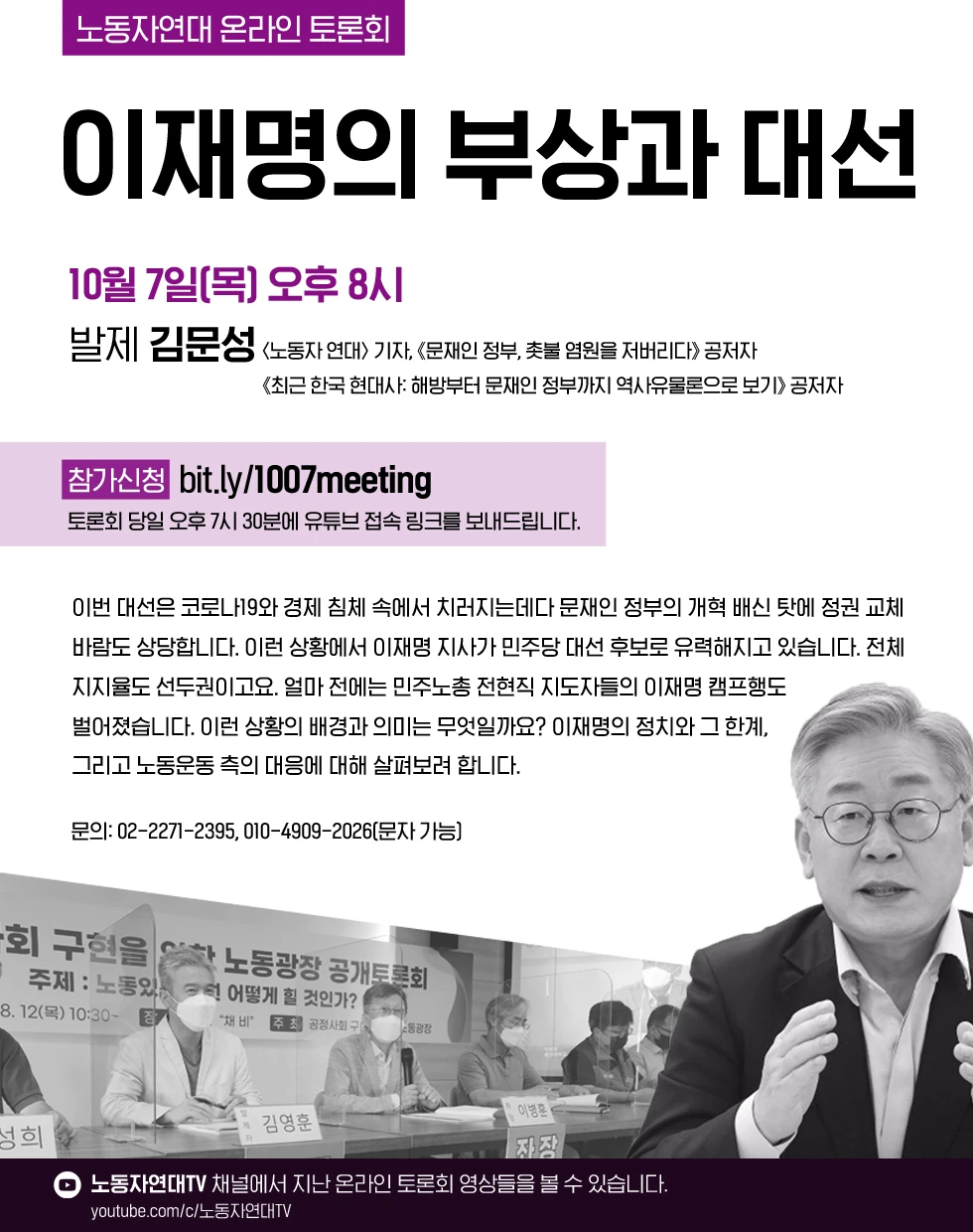 이번 대선은 코로나19와 경제 침체 속에서 치러지는데다 문재인 정부의 개혁 배신 탓에 정권 교체 바람도 상당합니다. 이런 상황에서 이재명 지사가 민주당 대선 후보로 유력해지고 있습니다. 전체 지지율도 선두권이고요. 얼마 전에는 민주노총 전현직 지도자들의 이재명 캠프행도 벌어졌습니다. 이런 상황의 배경과 의미는 무엇일까요? 이재명의 정치와 그 한계, 그리고 노동운동 측의 대응에 대해 살펴보려 합니다.