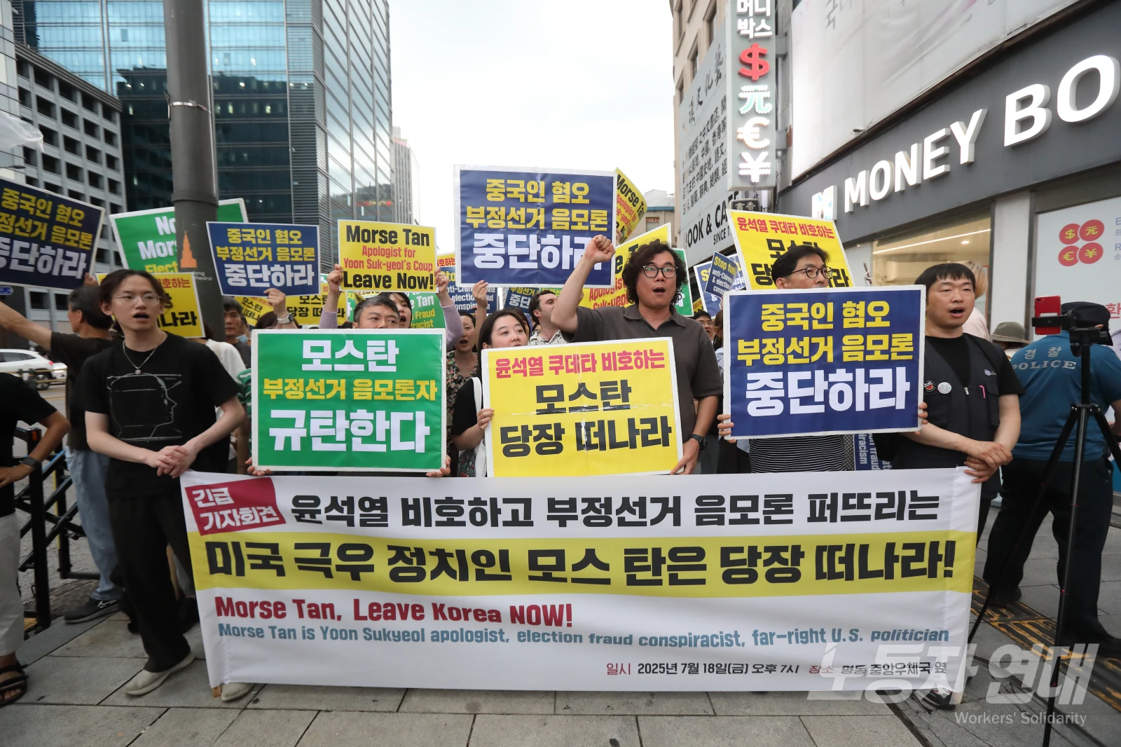 긴급하게 기자회견이 열려 모스 탄과 한국 극우에 반대하는 목소리를 높였습니다.