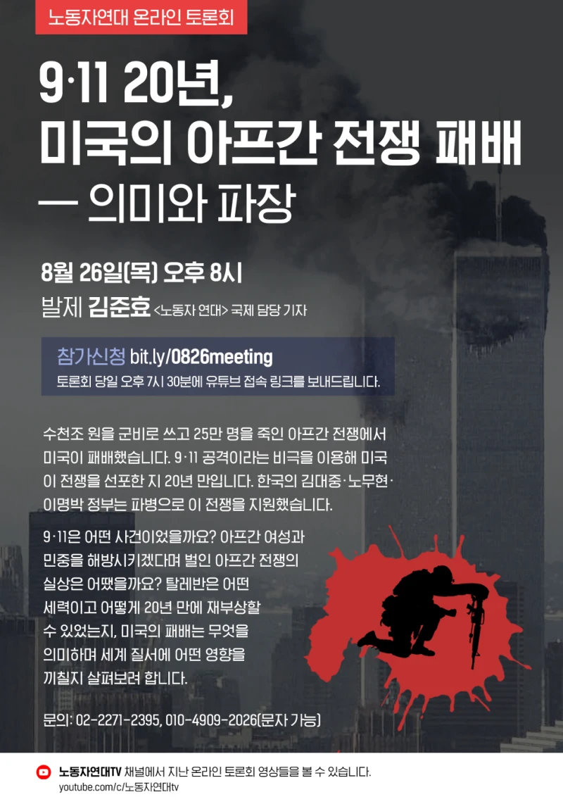 수천조 원을 군비로 쓰고 25만 명을 죽인 아프간 전쟁에서 미국이 패배했습니다. 9∙11 공격이라는 비극을 이용해 미국이 전쟁을 선포한 지 20년 만입니다. 한국의 김대중∙노무현∙이명박 정부는 파병으로 이 전쟁을 지원했습니다.