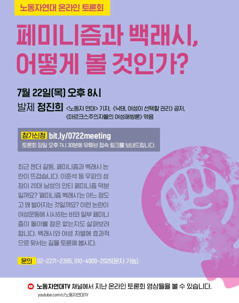 최근 젠더 갈등, 페미니즘과 백래시 논란이 뜨겁습니다. 이준석 등 우파의 성장이 20대 남성의 안티 페미니즘 덕분일까요? ‘페미니즘 백래시’는 어느 정도고 왜 벌어지는 것일까요? 이런 논란이 여성운동에 시사하는 바와 일부 페미니즘이 돌아볼 점은 없는지도 살펴보려 합니다. 백래시와 여성 차별에 효과적으로 맞서는 길을 토론해 봅시다.