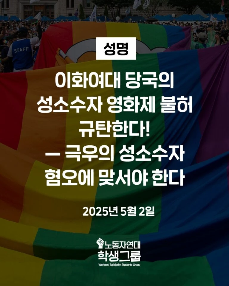 👉 [노동자연대 학생그룹 성명] 이화여대 당국의 성소수자 영화제 불허 규탄한다! — 극우의 성소수자 혐오에 맞서야 한다