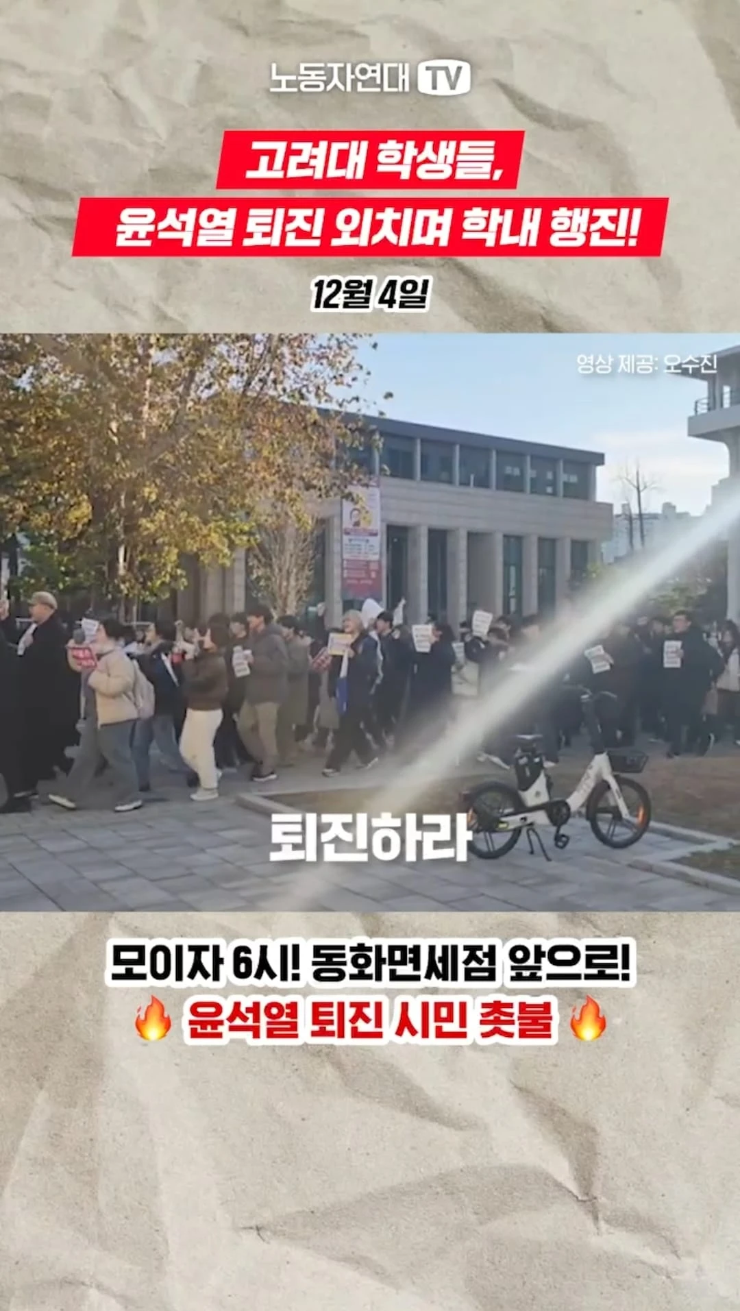 12월 4일 낮, 고려대 학생들 300여 명이 학내 행진을 벌였습니다. 계엄 선포라는 반민주 폭거를 저지른 윤석열의 퇴진을 외쳤습니다.