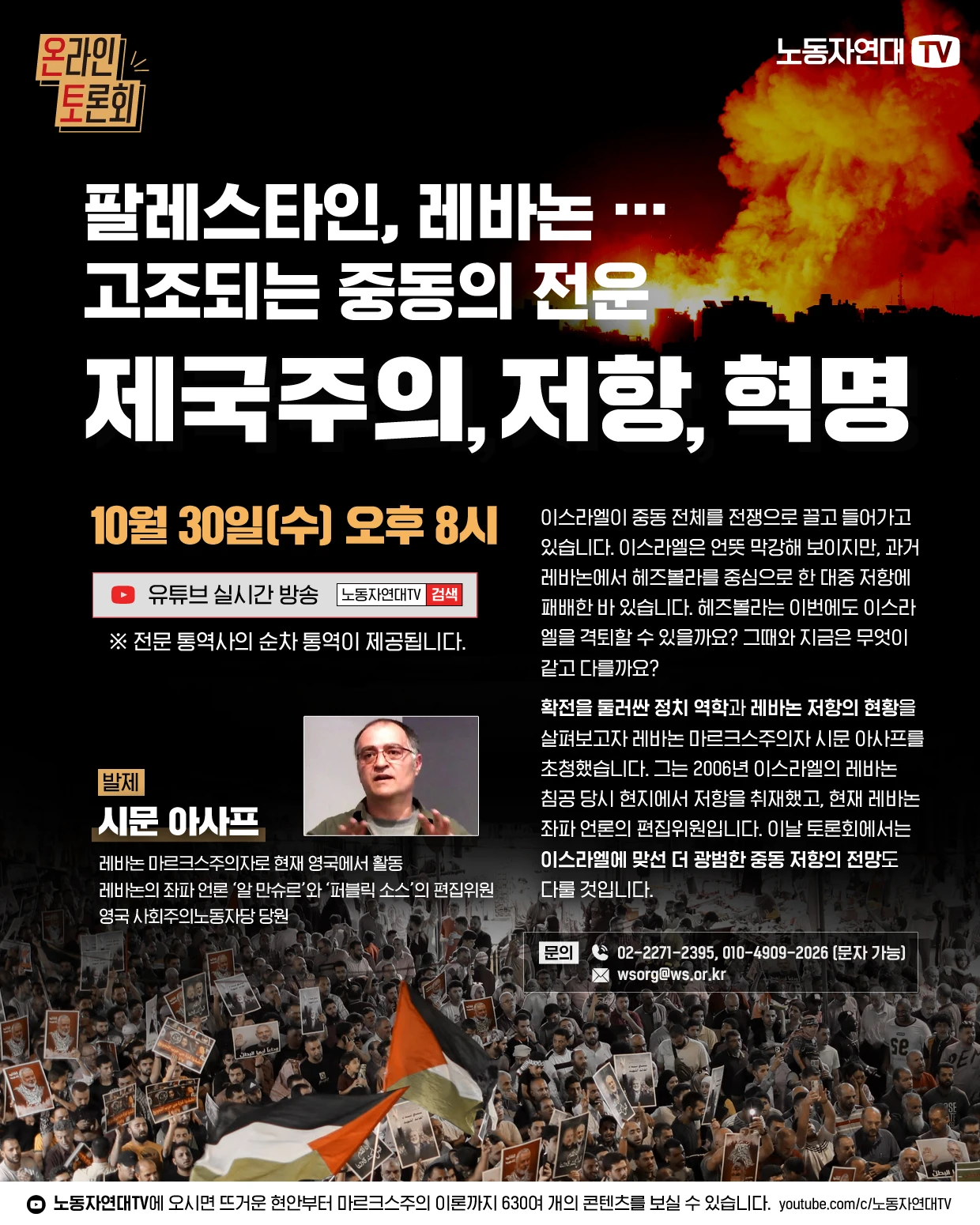 이스라엘이 중동 전체를 전쟁으로 끌고 들어가고 있습니다. 이스라엘은 언뜻 막강해 보이지만, 과거 레바논에서 헤즈볼라를 중심으로 한 대중 저항에 패배한 바 있습니다. 헤즈볼라는 이번에도 이스라엘을 격퇴할 수 있을까요? 그때와 지금은 무엇이 같고 다를까요? 확전을 둘러싼 정치 역학과 레바논 저항의 현황을 살펴보고자 레바논 마르크스주의자 시문 아사프를 초청했습니다. 그는 2006년 이스라엘의 레바논 침공 당시 현지에서 저항을 취재했고, 현재 레바논 좌파 언론의 편집위원입니다. 이날 토론회에서는 이스라엘에 맞선 더 광범한 중동 저항의 전망도 다룰 것입니다.