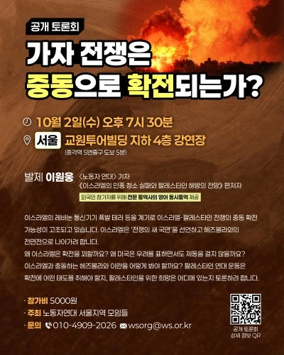 [공개 토론회] 가자 전쟁은 중동으로 확전되는가? 일시: 10월 2일(수) 오후 7시 30분 장소: 서울 교원투어빌딩 지하 4층 강연장(종각역 5번출구 도보 5분 / 서울시 종로구 청계천로 51-1) 발제: 이원웅 (〈노동자 연대〉 기자, 《이스라엘의 인종 청소 실패와 팔레스타인 해방의 전망》 편저자) ※ 외국인 참가자를 위해 전문 통역사의 영어 동시통역 제공 참가비: 5000원