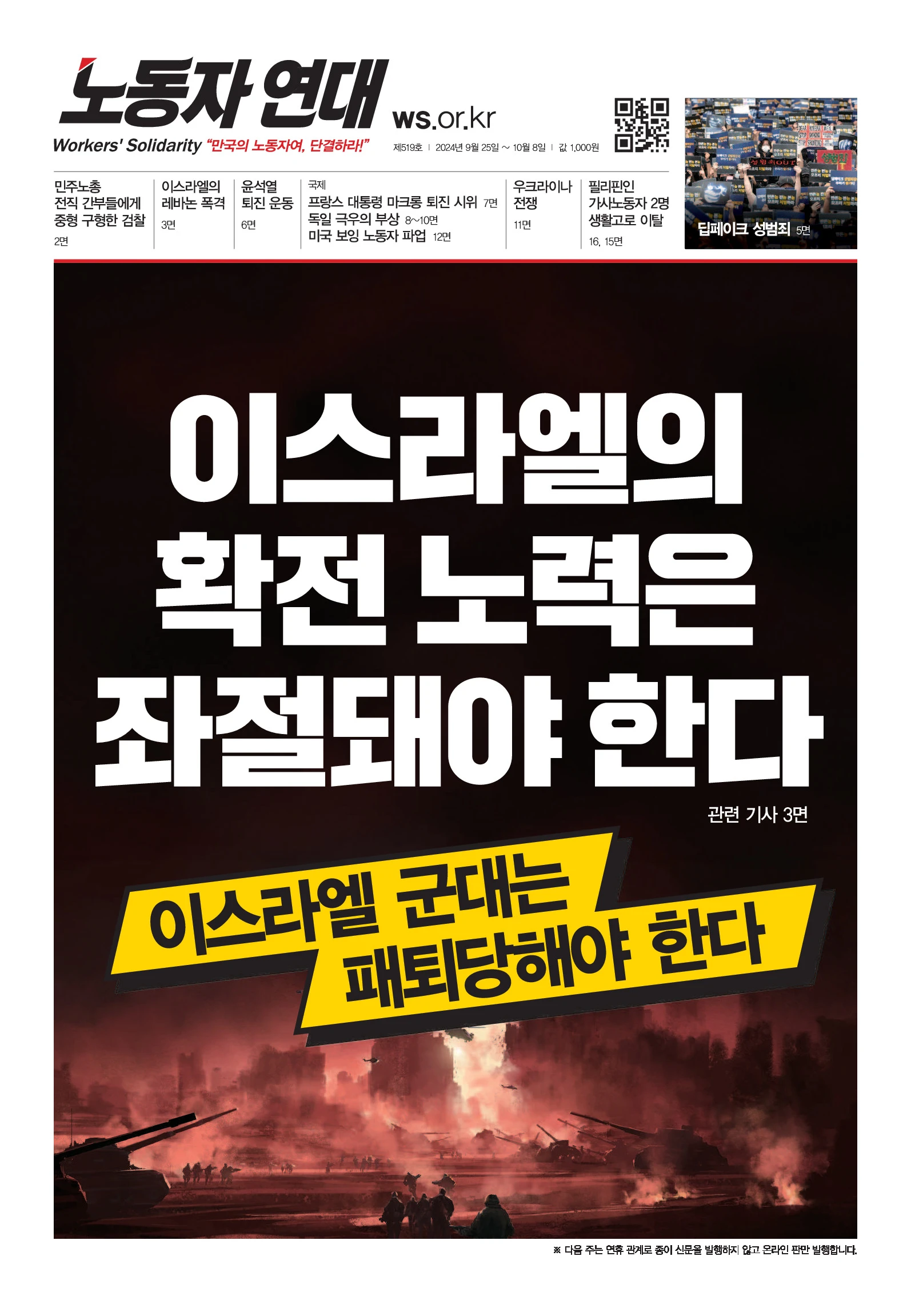 [공개 토론회] 가자 전쟁은 중동으로 확전되는가? 일시: 10월 2일(수) 오후 7시 30분 장소: 서울 교원투어빌딩 지하 4층 강연장(종각역 5번출구 도보 5분 / 서울시 종로구 청계천로 51-1) 발제: 이원웅 (〈노동자 연대〉 기자, 《이스라엘의 인종 청소 실패와 팔레스타인 해방의 전망》 편저자) ※ 외국인 참가자를 위해 전문 통역사의 영어 동시통역 제공 참가비: 5000원