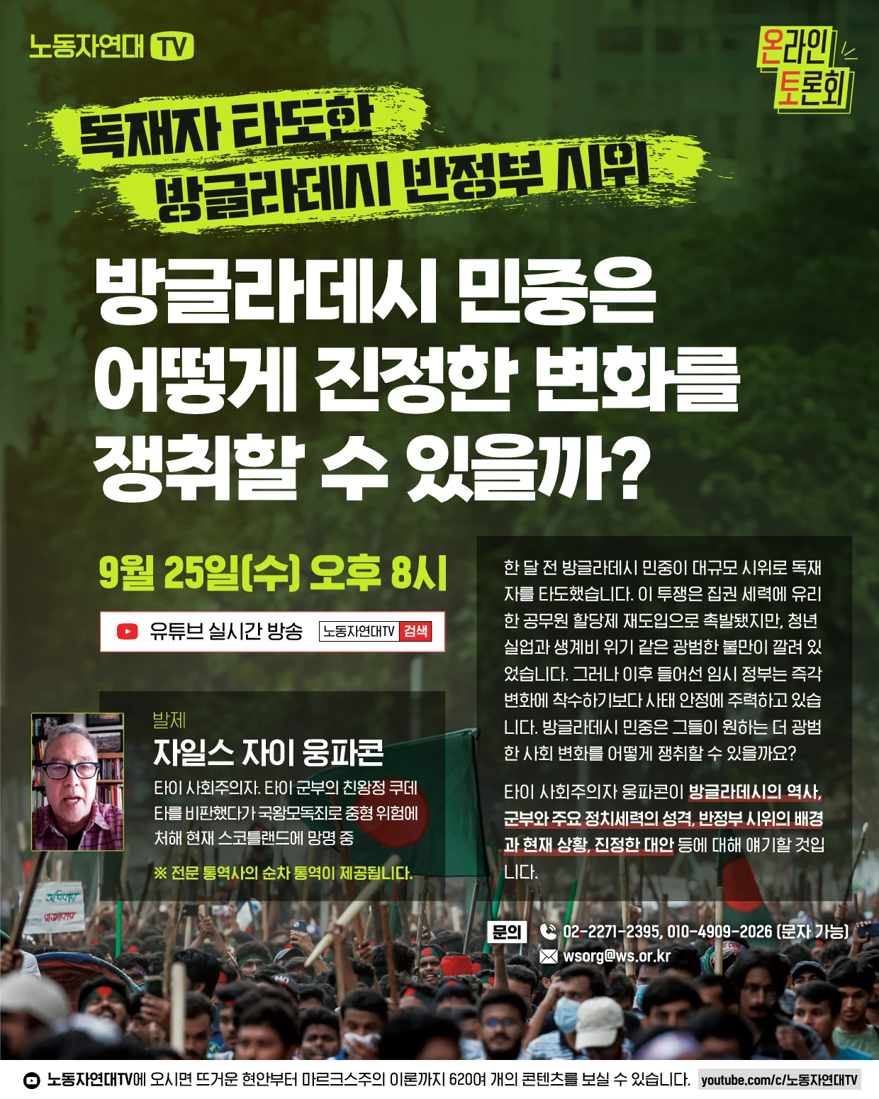 [노동자연대 온라인 토론회] 독재자 타도한 방글라데시 반정부 시위: 방글라데시 민중은 어떻게 진정한 변화를 쟁취할 수 있을까? - 일시: 9월 25일(수) 오후 8시 - 발제: 자일스 자이 웅파콘 (타이 사회주의자. 타이 군부의 친왕정 쿠데타를 비판했다가 국왕모독죄로 중형 위험에 처해 현재 스코틀랜드에 망명 중) ※ 전문 통역사의 순차 통역이 제공됩니다.