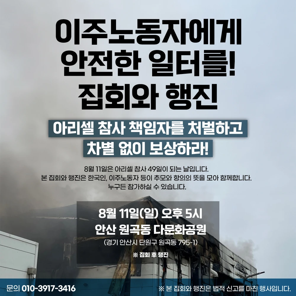 8월 11일은 아리셀 참사 49일이 되는 날이었습니다. 이날 안산에서는 많은 이주노동자와 한국인들이 “이주노동자들에게 안전한 일터”를 요구하는 집회와 행진을 벌였습니다. 그리고 ‘목숨 값’까지 차별하는 아리셀 사측과 정부에 맞서 항의와 추모의 목소리를 냈습니다. 안산은 이주민의 도시로서, 아리셀 참사 피해자들이 많이 살던 곳이기도 합니다. 그 뜨거운 현장을 영상으로 확인해 보세요!