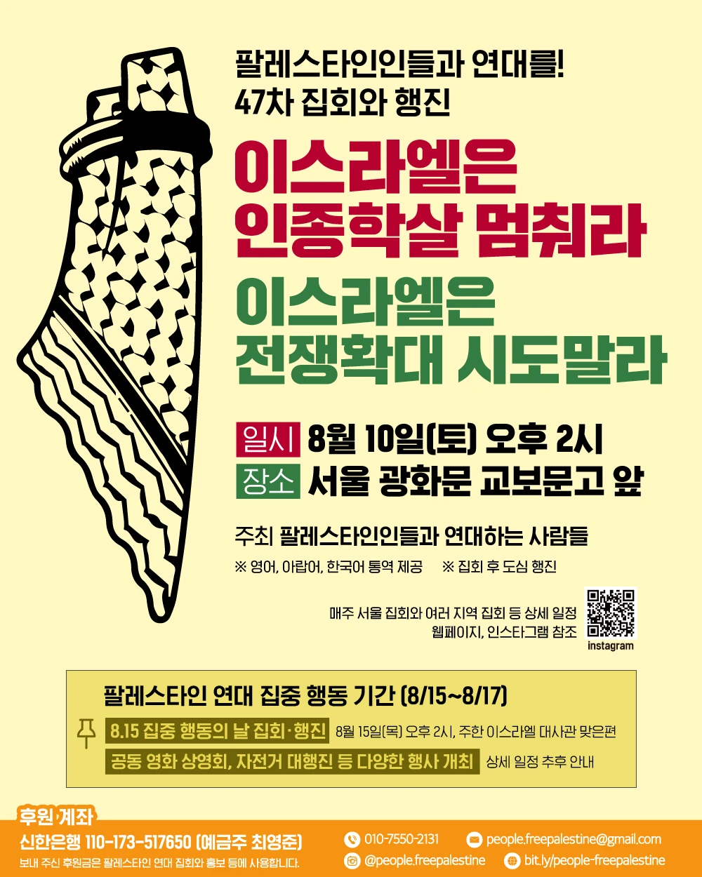 👉문의: 010-7550-2131 / people.freepalestine@gmail.com ▷ 웹페이지: bit.ly/people-freepalestine ▷ 인스타그램 @people.freepalestine -------------- 🇵🇸 [팔레스타인 연대 집중 행동 기간(8/15~8/17)] 📌8.15 집중 행동의 날 집회·행진 8월 15일(목요일) 오후 2시, 주한 이스라엘 대사관 맞은편 📌공동 영화 상영회, 자전거 대행진 등 다양한 행사 개최 상세 일정 추후 공지 -------------- 매주 서울 집회와 여러 지역 집회 등 상세 일정은 웹페이지와 인스타그램 참조 -------------- ○ 후원 계좌: 신한은행 110-173-517650 (예금주 최영준) 보내 주신 후원금은 팔레스타인 연대 집회와 홍보 등에 사용합니다.