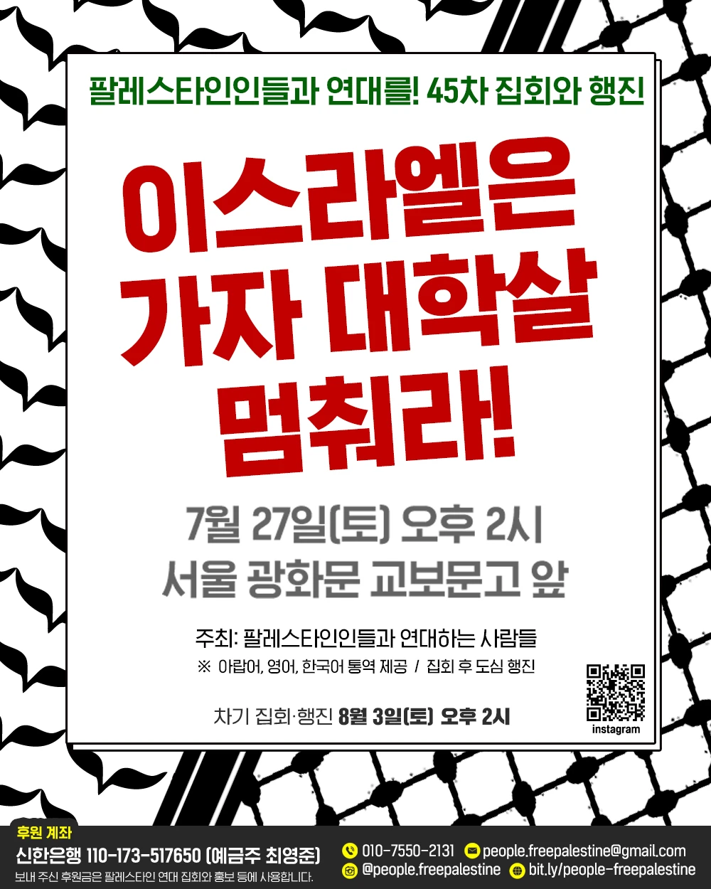 👉문의: 010-7550-2131 / people.freepalestine@gmail.com ▷ 웹페이지: bit.ly/people-freepalestine ▷ 인스타그램 @people.freepalestine -------------- [차기 집회와 행진] 📌 8월 3일(토) 오후 2시 -------------- ○ 후원 계좌: 신한은행 110-173-517650 (예금주 최영준) 보내 주신 후원금은 팔레스타인 연대 집회와 홍보 등에 사용합니다.