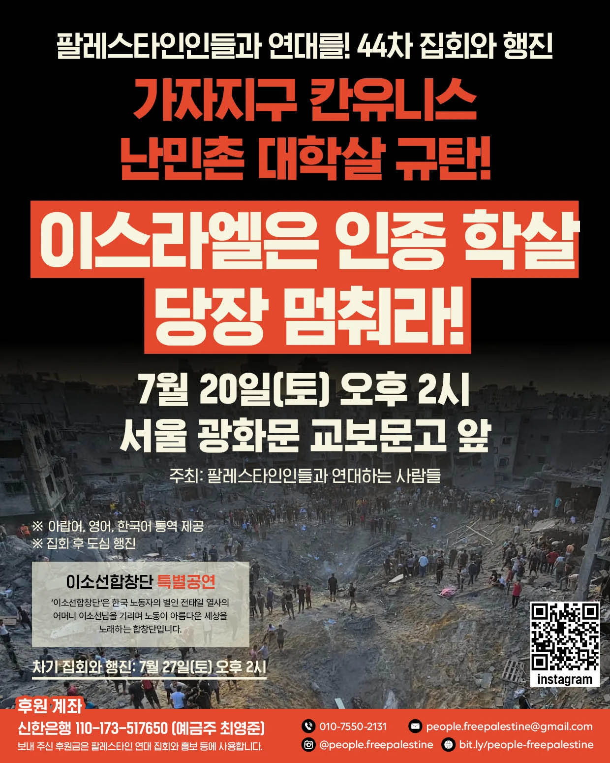 👉문의: 010-7550-2131 / people.freepalestine@gmail.com ▷ 웹페이지: bit.ly/people-freepalestine ▷ 인스타그램 @people.freepalestine -------------- [차기 집회와 행진] 📌 7월 27일(토) 오후 2시 -------------- ○ 후원 계좌: 신한은행 110-173-517650 (예금주 최영준) 보내 주신 후원금은 팔레스타인 연대 집회와 홍보 등에 사용합니다.