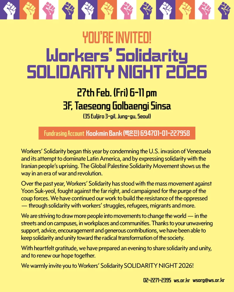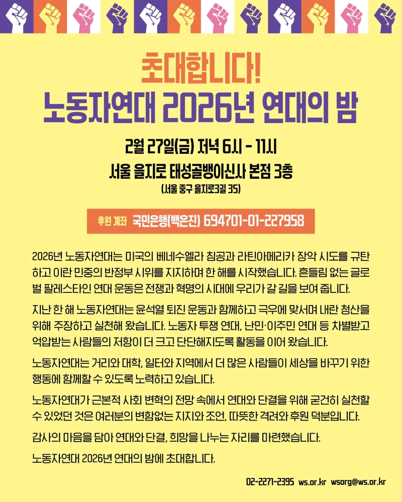 감사의 마음을 담아 연대와 단결, 희망을 나누는 자리를 마련했습니다. 노동자연대 2026년 연대의 밤에 초대합니다.